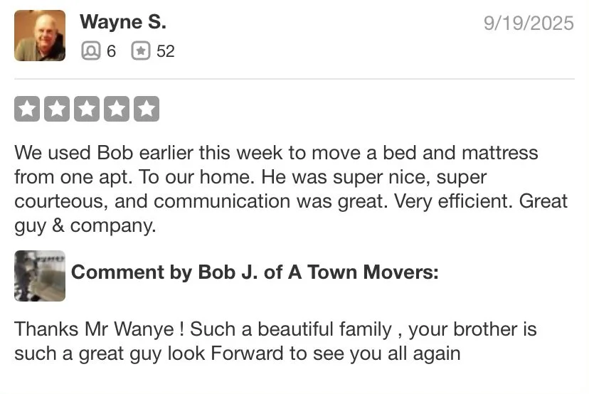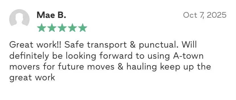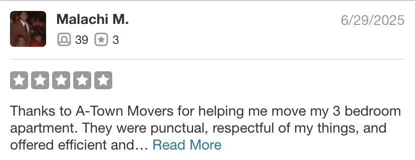 On Yelp, A-Town Movers stands out as a 5-star rated Atlanta moving company, recognized for our exceptional customer service and attention to detail. Clients rave about our friendly, professional movers who go above and beyond to make every move effortless. From packing and loading to furniture assembly, our team provides complete moving solutions that save customers time and stress. We’ve built our reputation on integrity, communication, and genuine care for our clients’ belongings. With countless repeat customers and referrals, our Yelp profile reflects why A-Town Movers is considered Atlanta’s most dependable moving company.